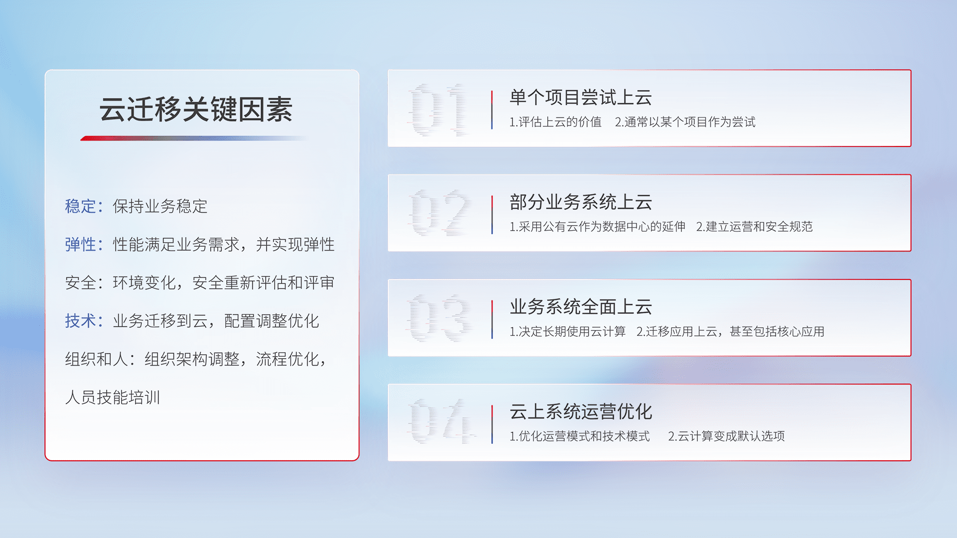 结合实际业务,,,,从规划设计、、、云平台选型、、云原生改造、、、数据迁移、、、、集成交付,,,,迁移全过程为客户识别最佳上云路径,,做好风险识别管理,,,,设计网络架构、、、、身份权限、、、安全审计合规、、操作审计、、日志审计、、监控告警策略、、、多站点容灾设计等,,,对云上基础设施进行整体规划,,,,提升IT治理水平,,以满足弹性、、、高可用、、、、高性能的需求。。。。