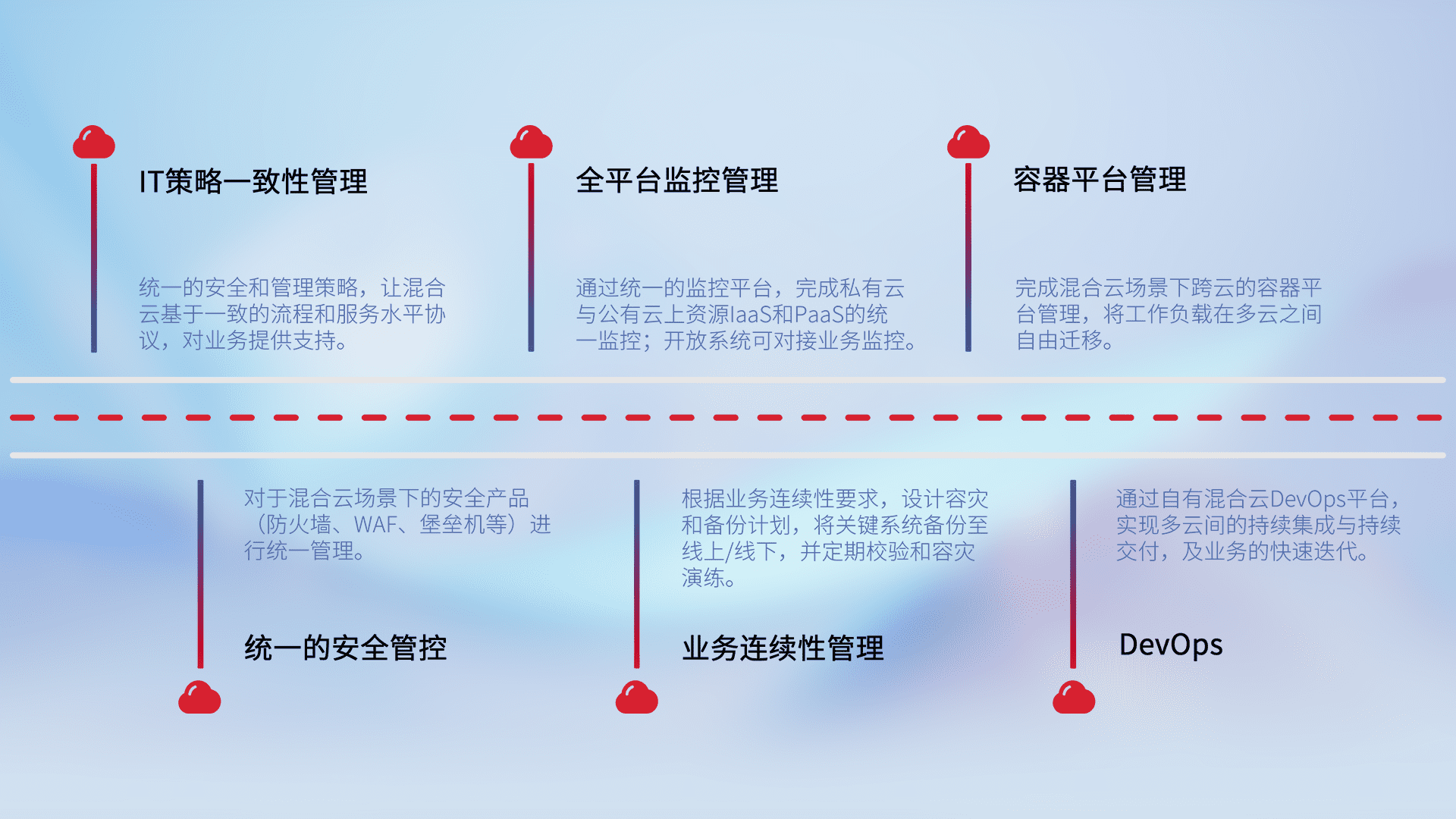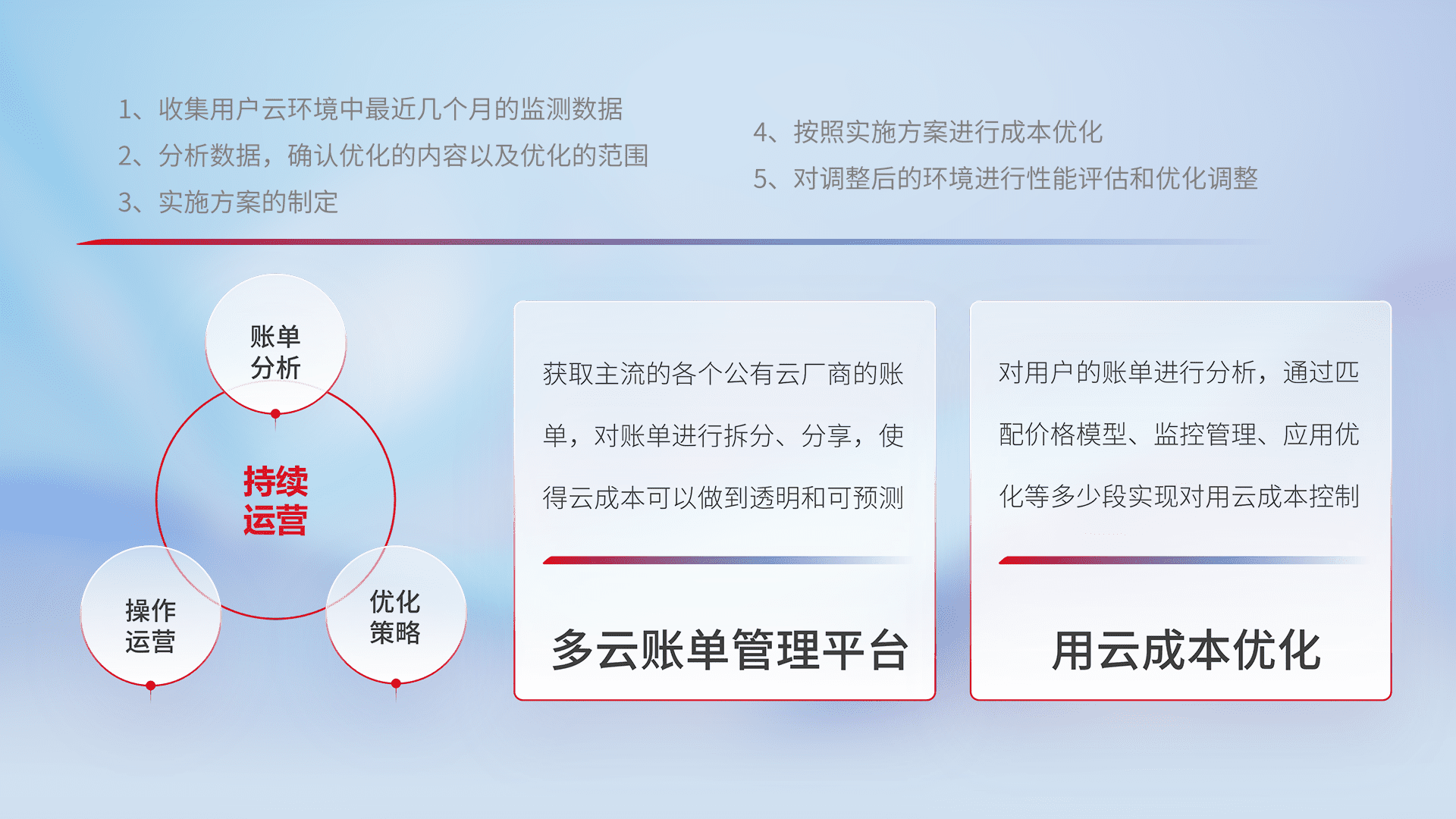 通过多云纳管,,,,以统一的资源数据模型把客户的云资源进行抽象和封装,,,进而实现对多云资源的统一操作,,,,保障云资源管理的可靠性、、稳定性与可用性。。。。量身定制化运维内容,,,配置、、、、开发运维、、、、补丁管理、、、备份、、、监控、、认证和访问管理、、、审计和日常巡检等,,保障在用云过程中的可靠度,,稳定度以及高可用率。。。